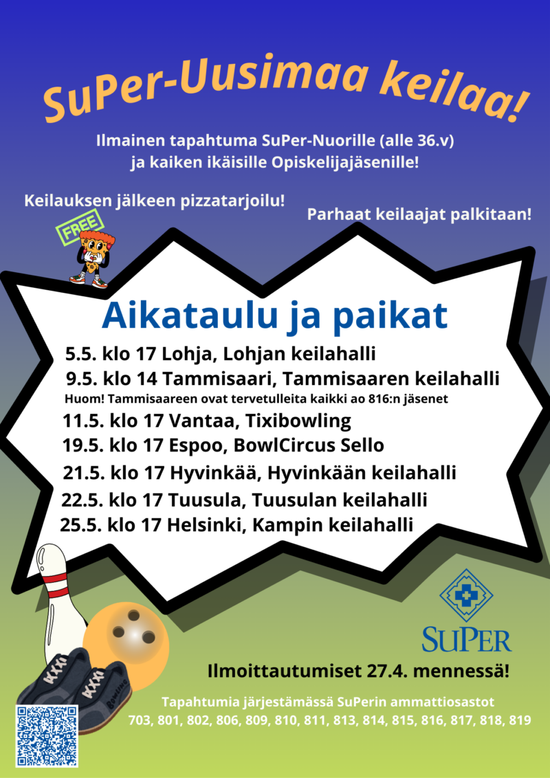 Useat Uudenmaan alueen ammattiosastot järjestävät yhteistyössä keilauskiertueen SuPer-nuorille ja kaiken ikäisille opiskelijajäsenille. Tervetuloa mukaan!
